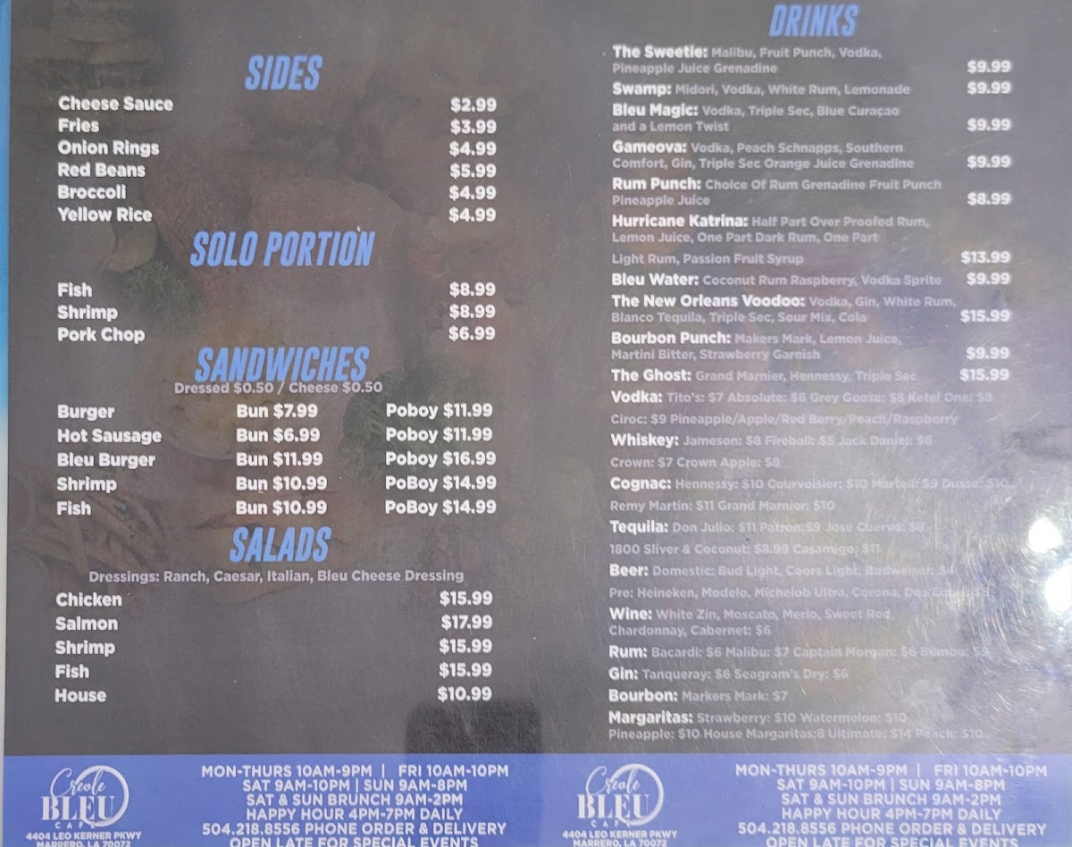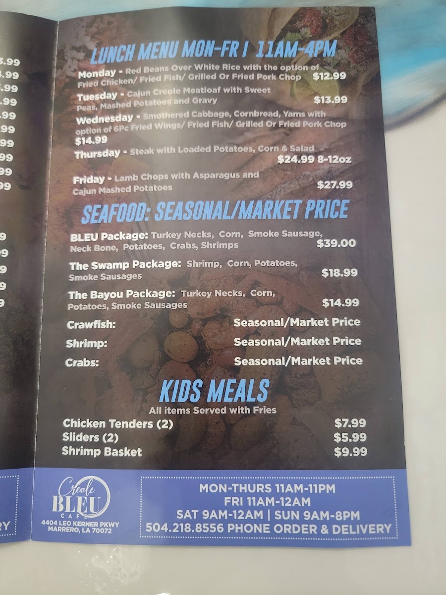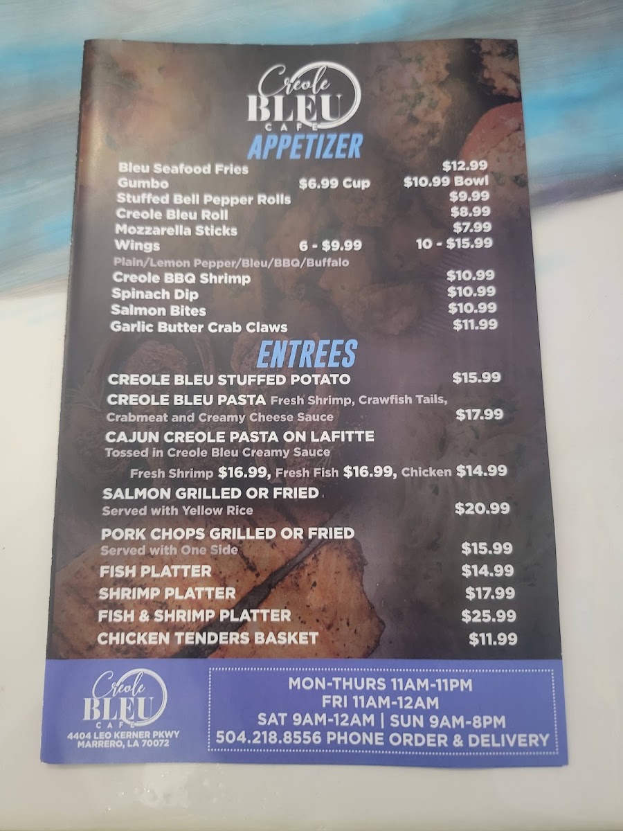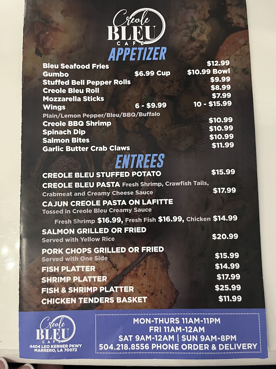 Cajun Bleu Cafe offers a variety of flavorful dishes, with something for everyone. The sandwich selection includes a classic Burger, ideal for those craving a hearty meal. If you're in the mood for something a little more unique, the Bleu Burger from the specialty burgers section stands out with its bold flavors. For those looking for a more substantial entree, the steak, lamb chop, and pork chop options are sure to satisfy. The Season Creole Steak, served with two sides, offers a perfect balance of spice and savory, while the Season Creole Steak/Pasta provides an interesting twist for pasta lovers. If you prefer a more traditional meal, the Classic Steak and Potato is always a comforting choice. Lastly, the Lamb Chops, served with two sides, is a great option for those seeking a tender and flavorful dish. With a diverse selection, Cajun Bleu Cafe’s menu promises an unforgettable dining experience, blending classic comfort with exciting new flavors.