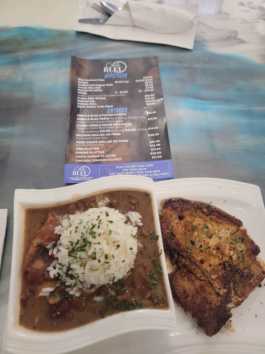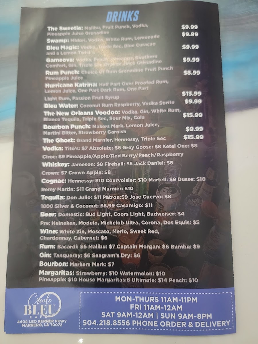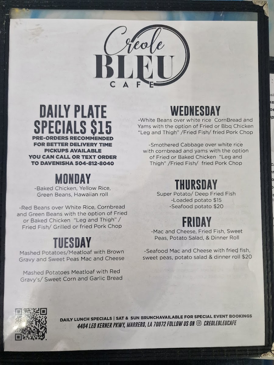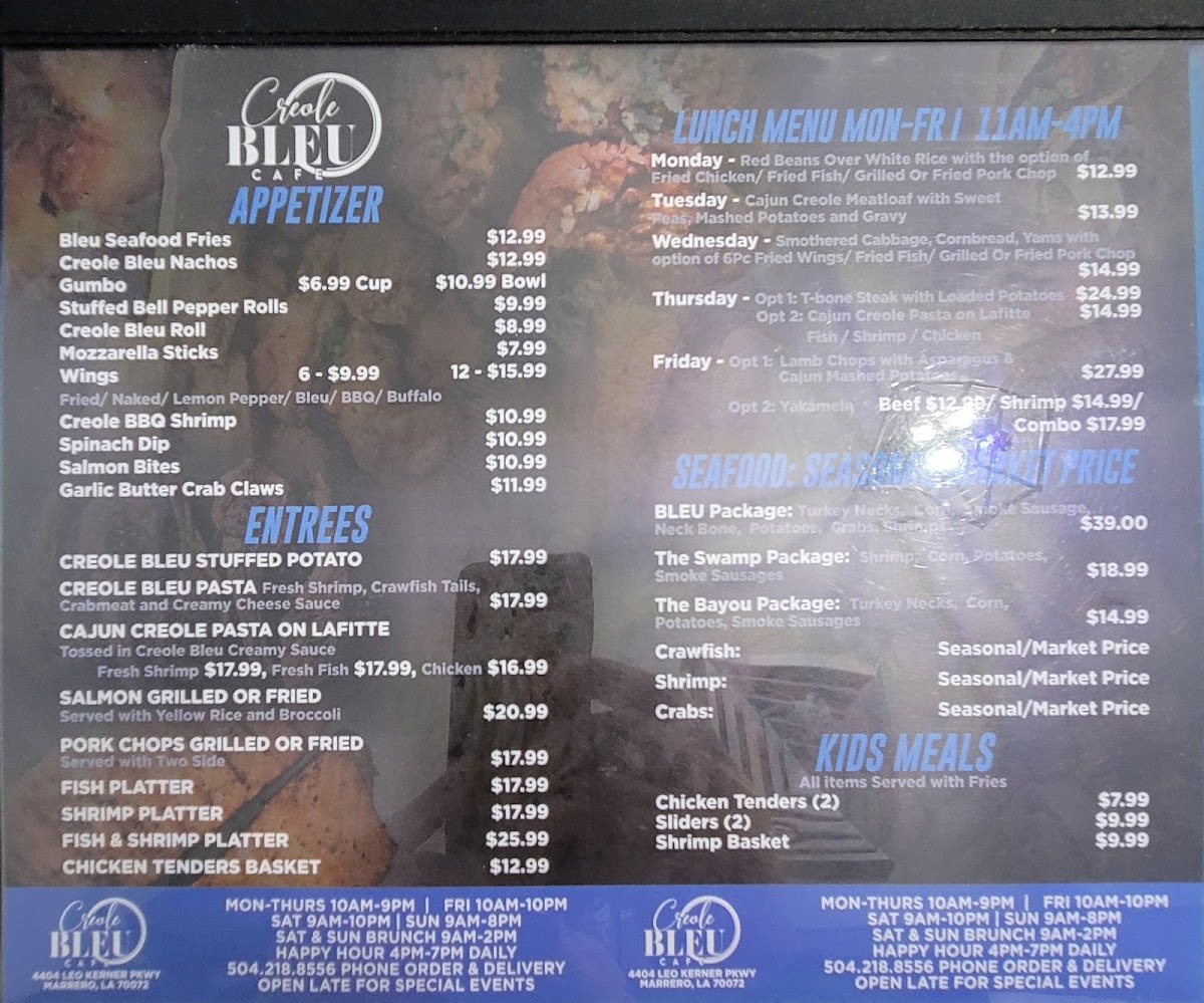 Cajun Bleu Cafe offers a variety of flavorful dishes, with something for everyone. The sandwich selection includes a classic Burger, ideal for those craving a hearty meal. If you're in the mood for something a little more unique, the Bleu Burger from the specialty burgers section stands out with its bold flavors. For those looking for a more substantial entree, the steak, lamb chop, and pork chop options are sure to satisfy. The Season Creole Steak, served with two sides, offers a perfect balance of spice and savory, while the Season Creole Steak/Pasta provides an interesting twist for pasta lovers. If you prefer a more traditional meal, the Classic Steak and Potato is always a comforting choice. Lastly, the Lamb Chops, served with two sides, is a great option for those seeking a tender and flavorful dish. With a diverse selection, Cajun Bleu Cafe’s menu promises an unforgettable dining experience, blending classic comfort with exciting new flavors.